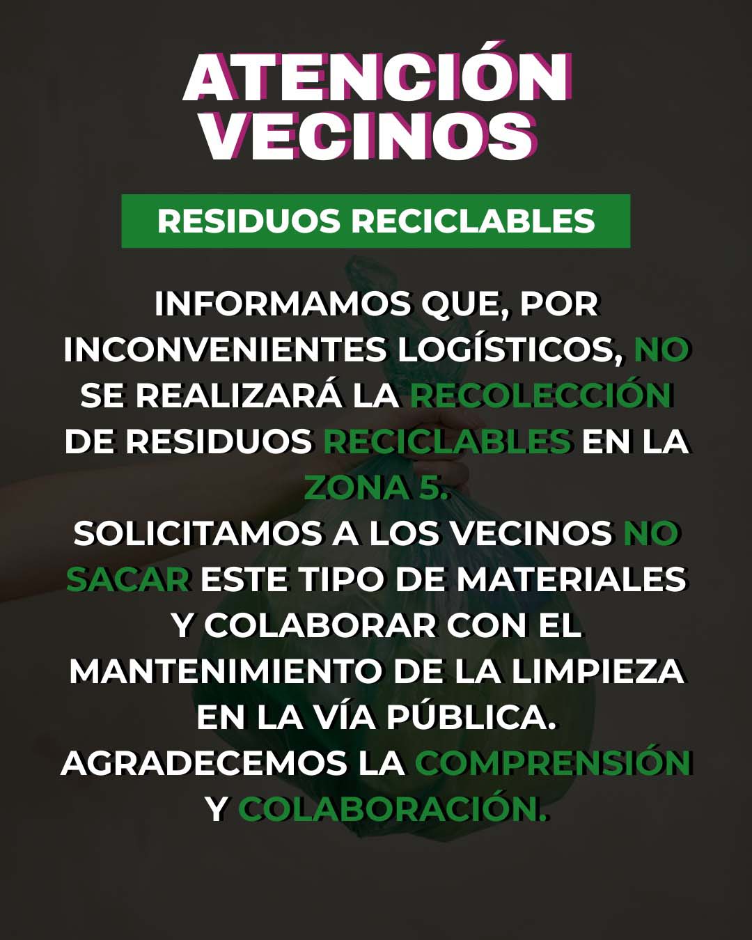 La Municipalidad de Nueve de Julio comunica a los vecinos y vecinas que, debido a inconvenientes logísticos, no se realizará la recolección de residuos reciclables en la Zona 5.