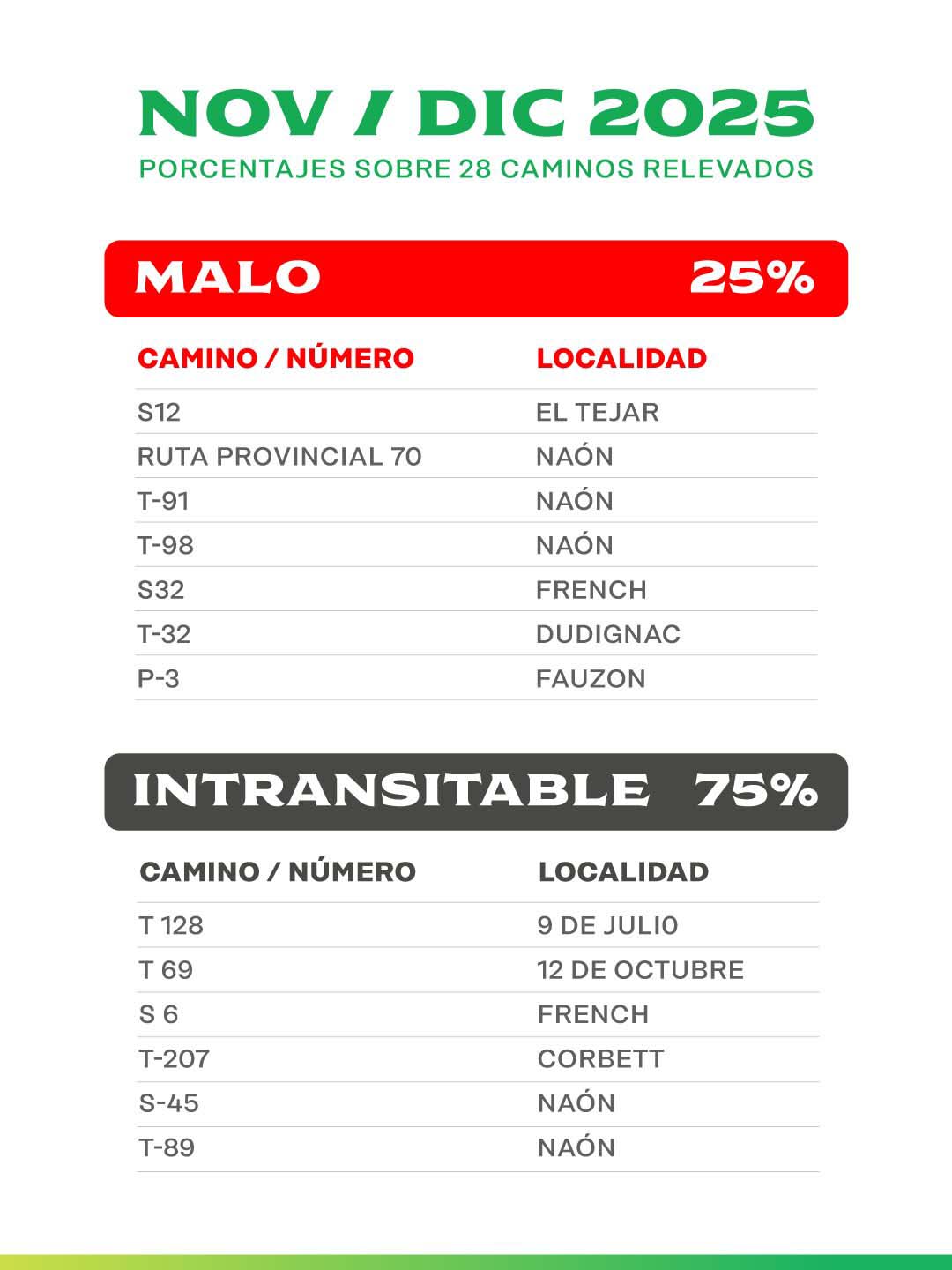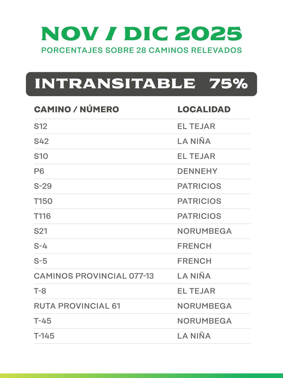 Hasta el mes de noviembre, casi la totalidad de los caminos secundarios, terciarios y algunos primarios estaban anegados por inundación, y a partir de los últimos días de noviembre 2025, las altas temperaturas, merma de lluvias y con mayor luz solar, los mismos fueron drenando, y dejando al descubierto otro serio problema: el estado de intransitabilidad en los mismos.