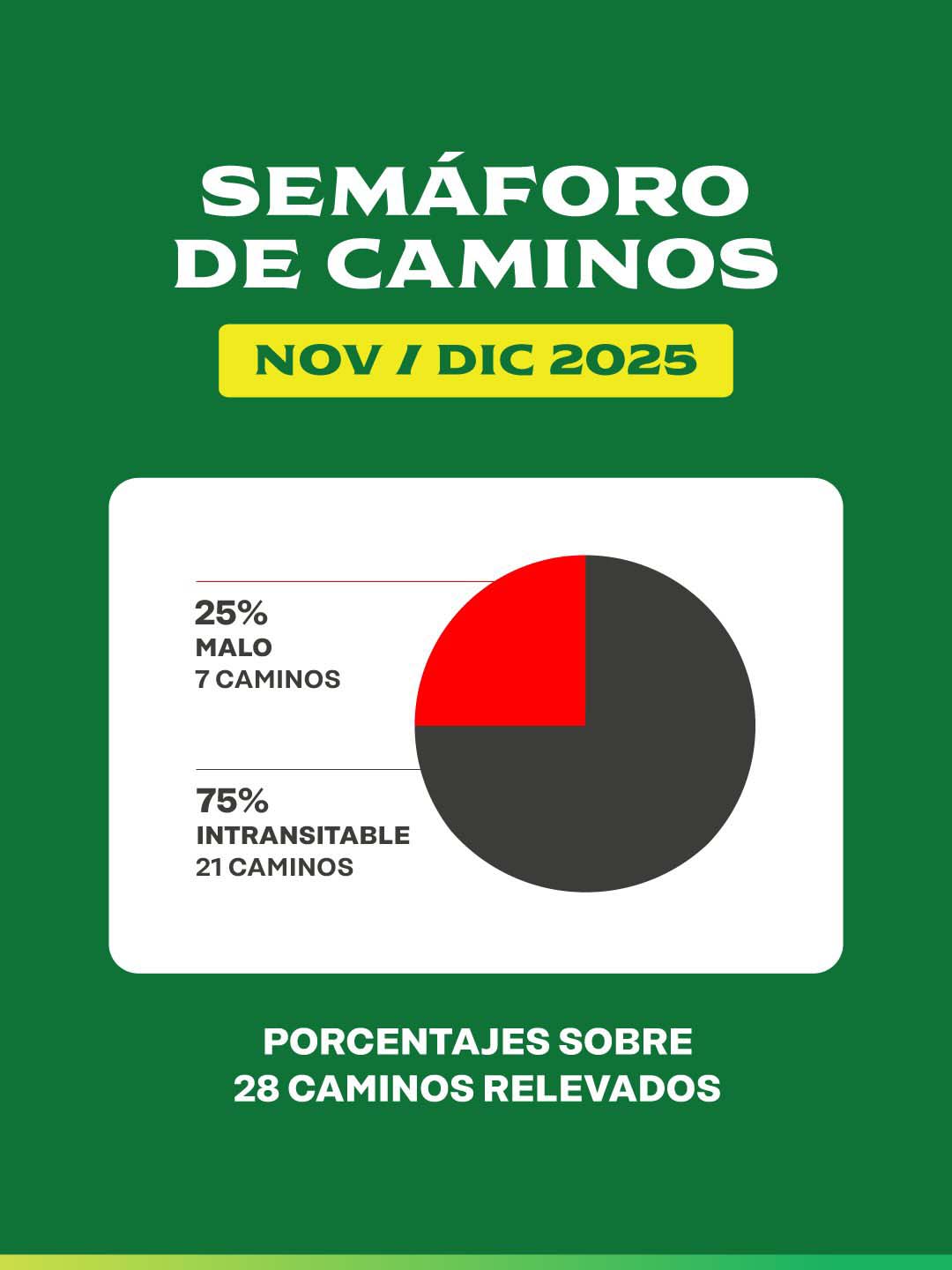 Del relevamiento mensual sobre el estado de caminos, 28 en total informados, surge que el 75% está en estado intransitable, y solo un 25%, en mal estado.