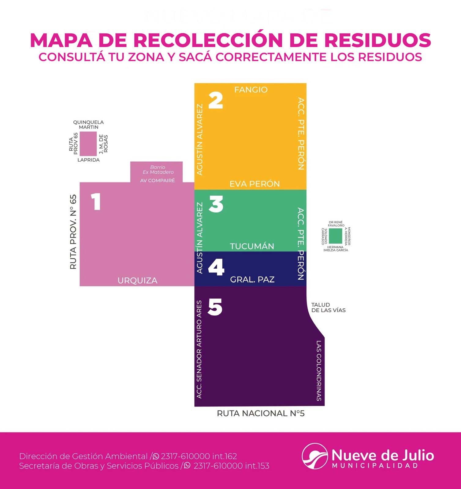 La Municipalidad de Nueve de Julio recuerda las zonas en las que se divide la ciudad para efectuar la recolección de carpidos, productos de poda y escombros; como así también residuos reciclables, para así eficientizar el servicio.