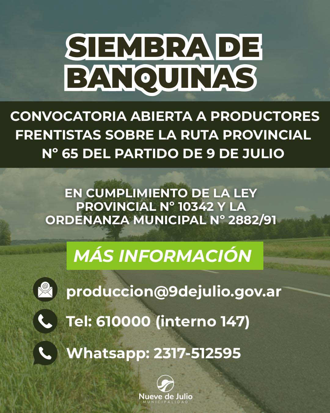 La Municipalidad de Nueve de Julio lanzó una convocatoria dirigida a productores frentistas para la siembra de las franjas adyacentes sobre la Ruta Provincial Nº 65, en el marco de lo establecido por la Ley Provincial 10.342 y la Ordenanza Municipal 2882/91.