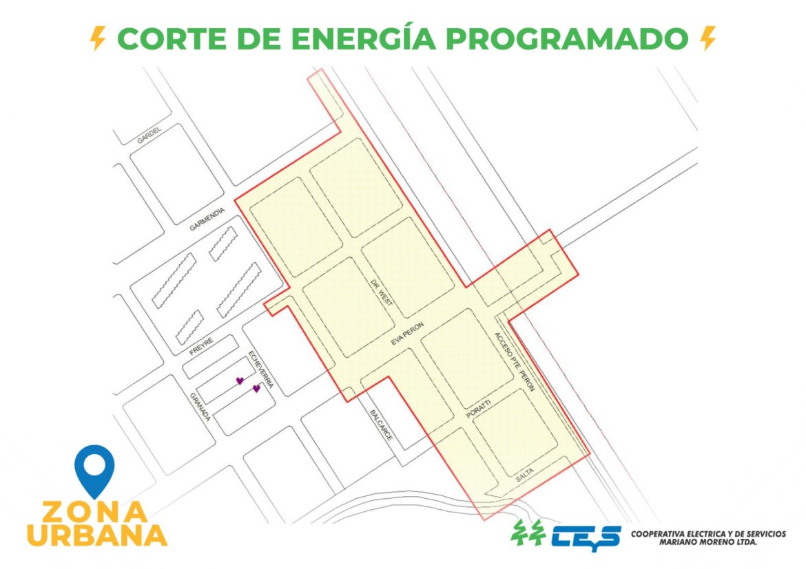 En el horario de 7,30 a 11 h se producirá un corte de energía por tareas de mantenimiento (zona delimitada en imagen por líneas rojas).