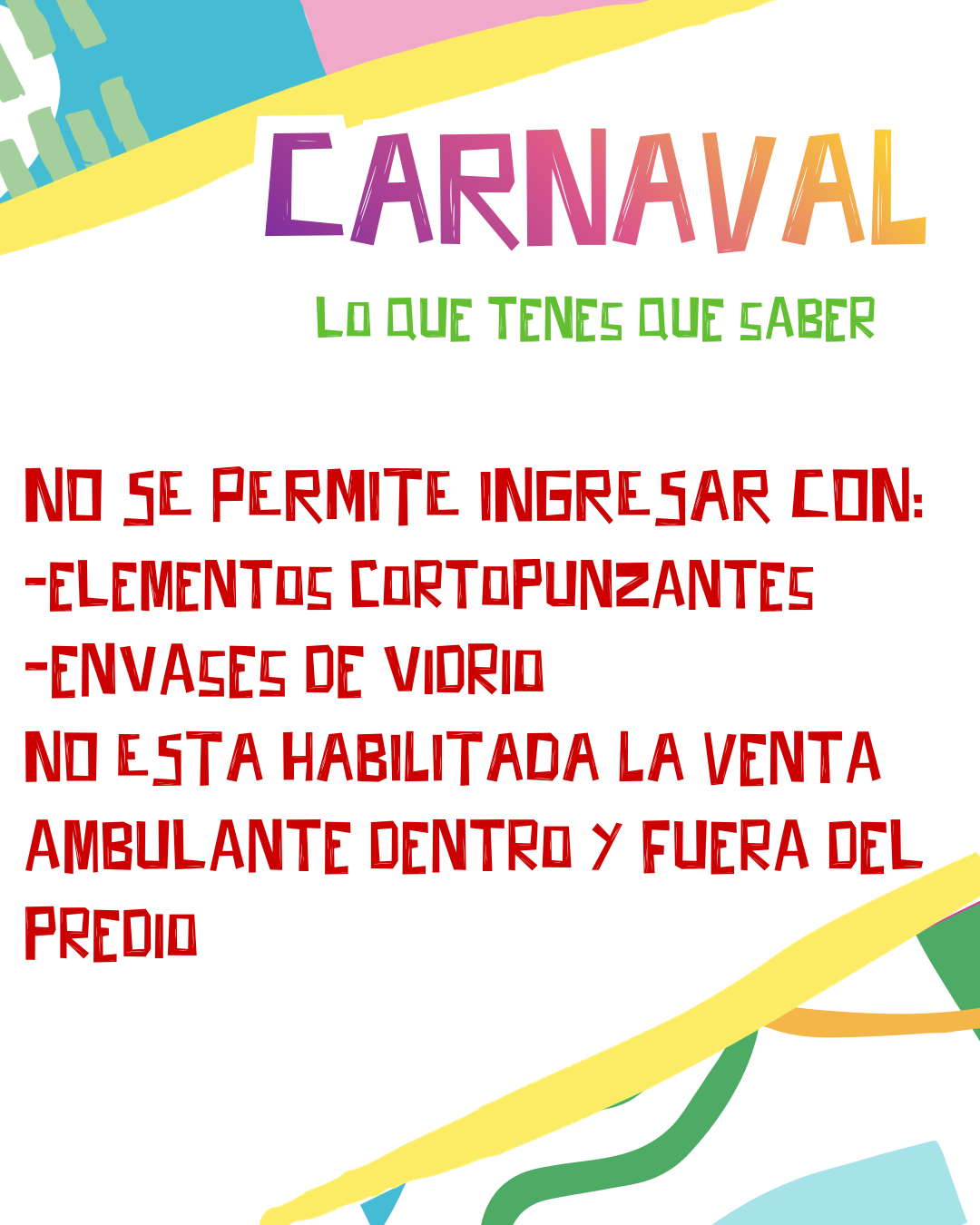 No se permitirá el ingreso con envases de vidrio ni elementos cortopunzantes.