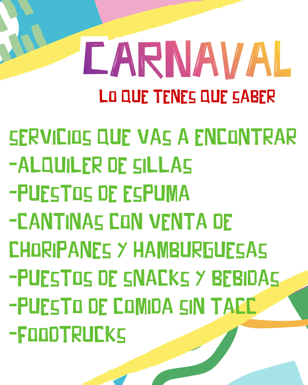 El evento contará con: alquiler de sillas, puestos de espuma, cantinas con venta de choripanes y hamburguesas, puestos de snacks y bebidas, puesto de comida sin TACC y foodtrucks.