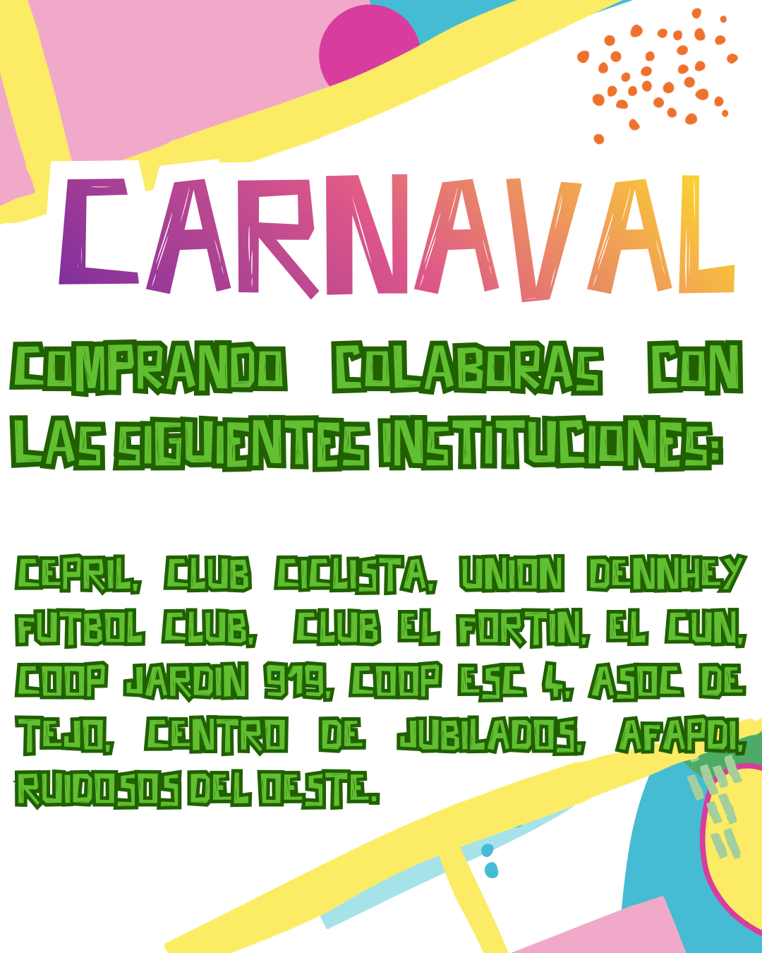 Esta nueva edición del Carnaval cuenta con el acompañamiento fundamental de diversas instituciones de la comunidad: CEPRIL, CUN, Club Ciclista, AFAPDi, Centro de Jubilados, Cooperadora Escuela N°4, Cooperadora Jardín 919, Asociación de Tejo, Ruidosos del Oeste, Unión Dennehy Fútbol Club y Club El Fortín.