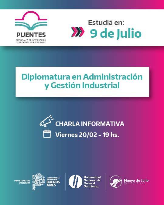 La Municipalidad de Nueve de Julio invita a participar de una charla informativa virtual a los alumnos la Diplomatura en Administración y Gestión Industrial, una propuesta educativa que se dicta en el marco del programa Puentes.